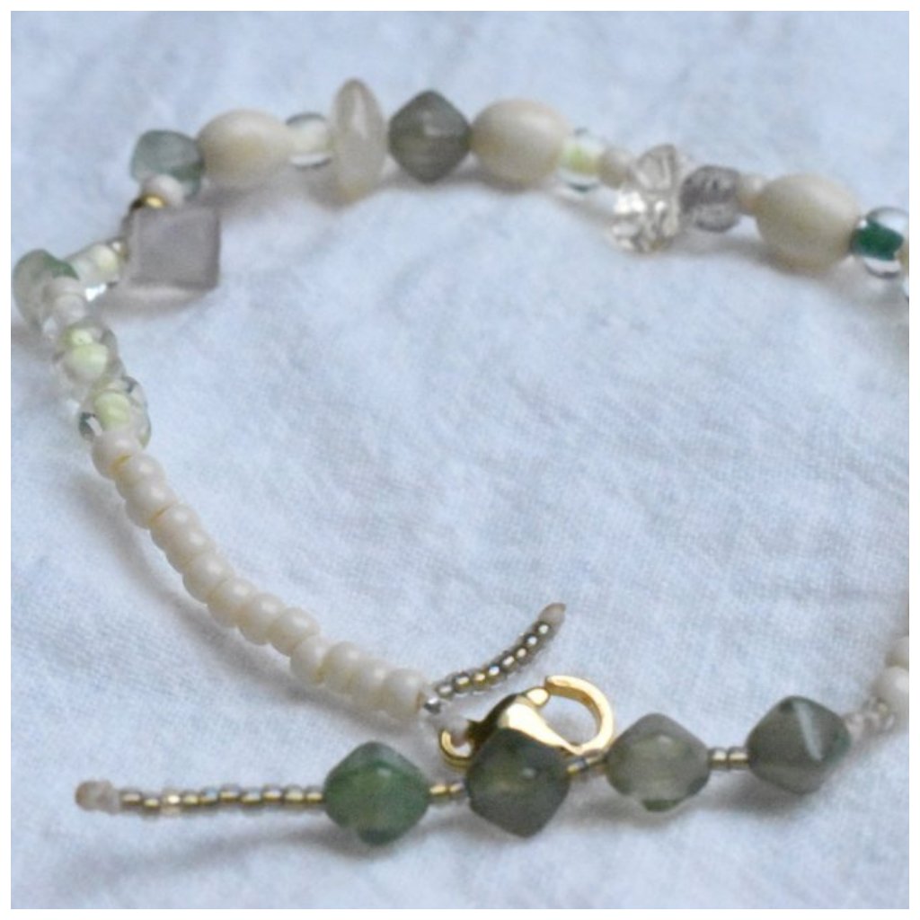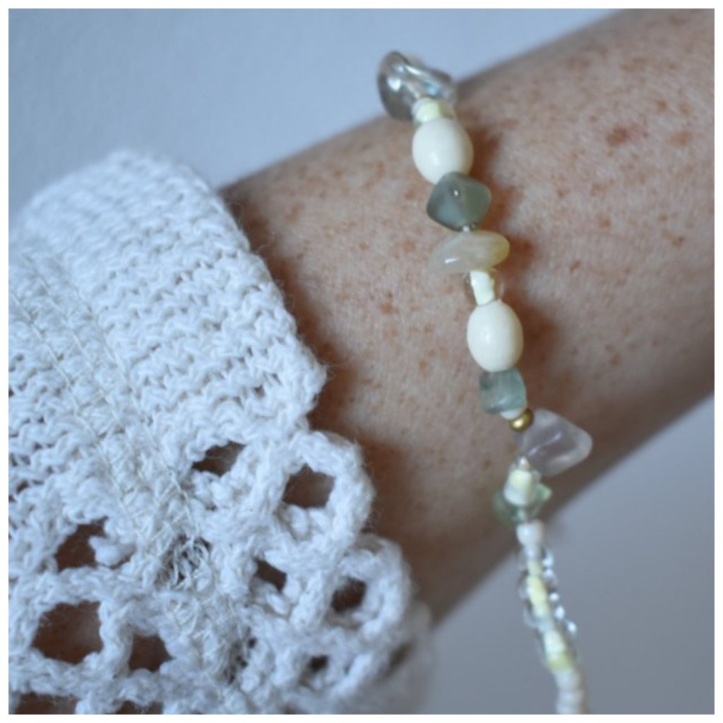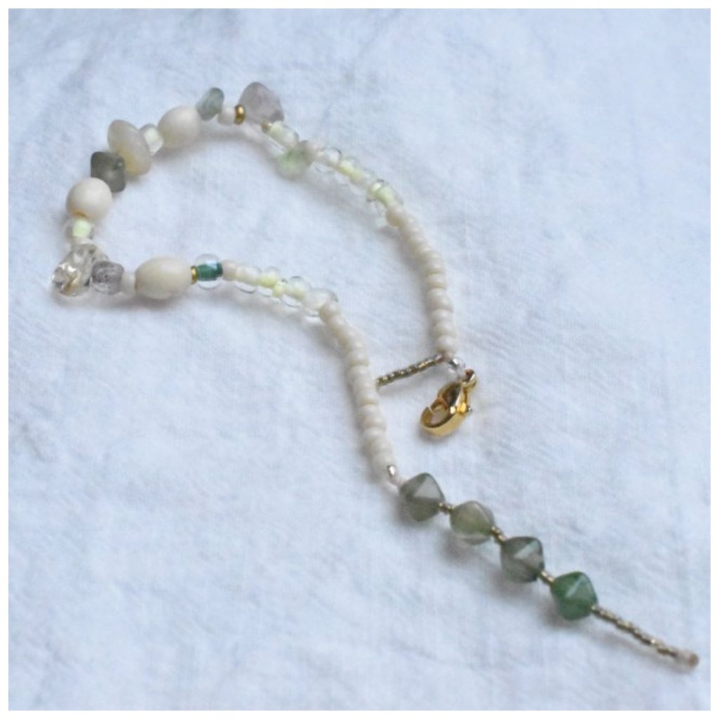 Každý korálek je pečlivě vybrán tak, aby spolu tvořily vyváženou kompozici – od mléčných odstínů přes jemnou zelenou až po zlatavé akcenty. Náramek je díky tomu snadno kombinovatelný a hodí se jak k minimalistickému outfitu, tak k romantickým šatům.