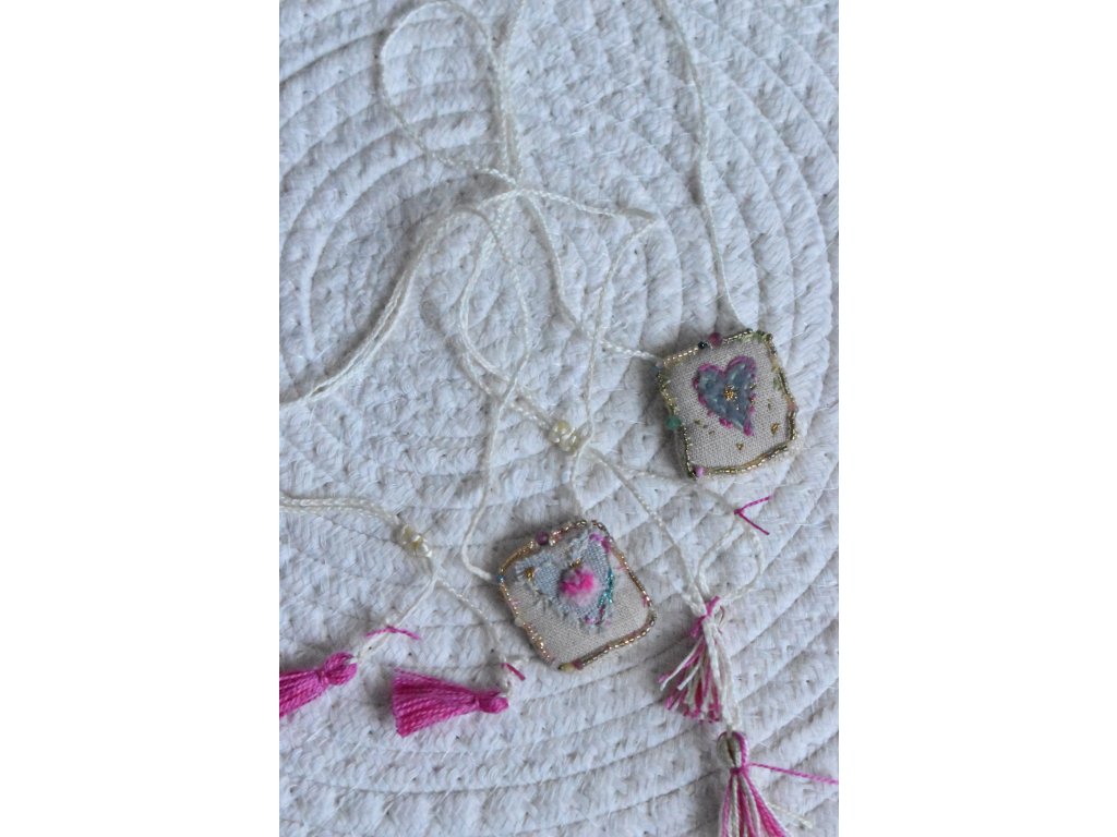 Každý z těchto náhrdelníků je jedinečný a neopakovatelný. Je to amulet, do kterého byla steh za stehem všitá ochranná moc. Každý začal vyprávět příběh, který bude pokračovat s jeho nositelkou.