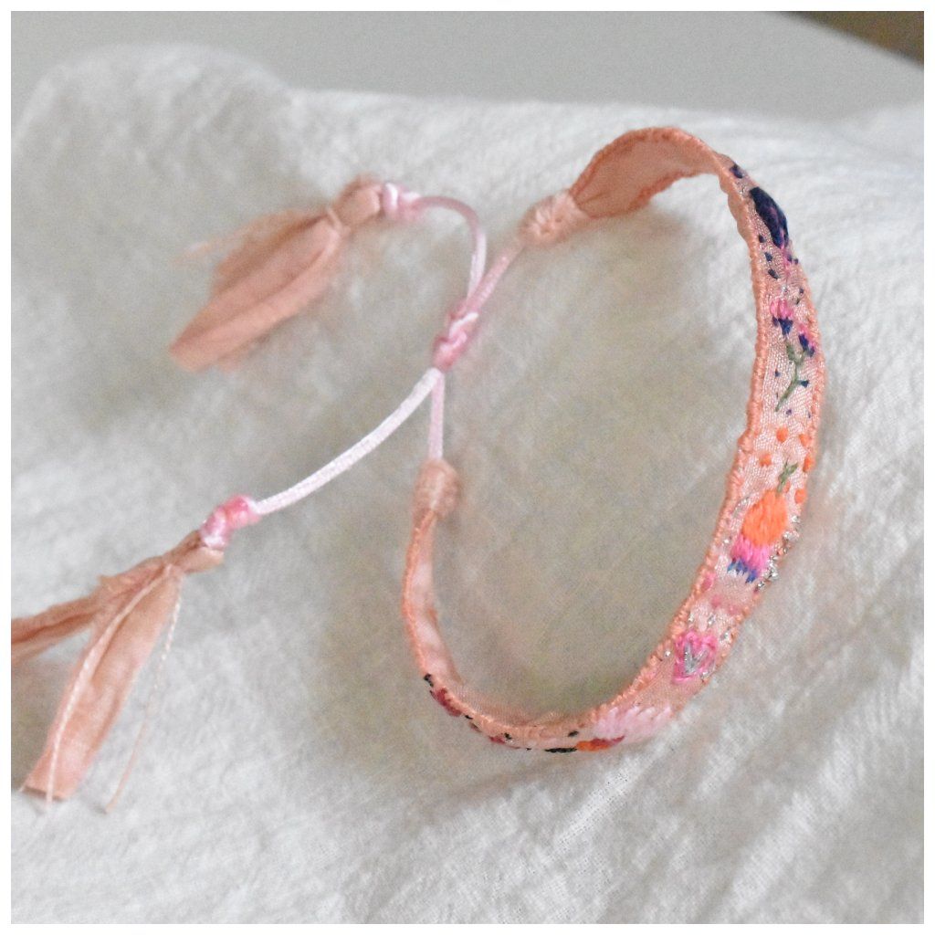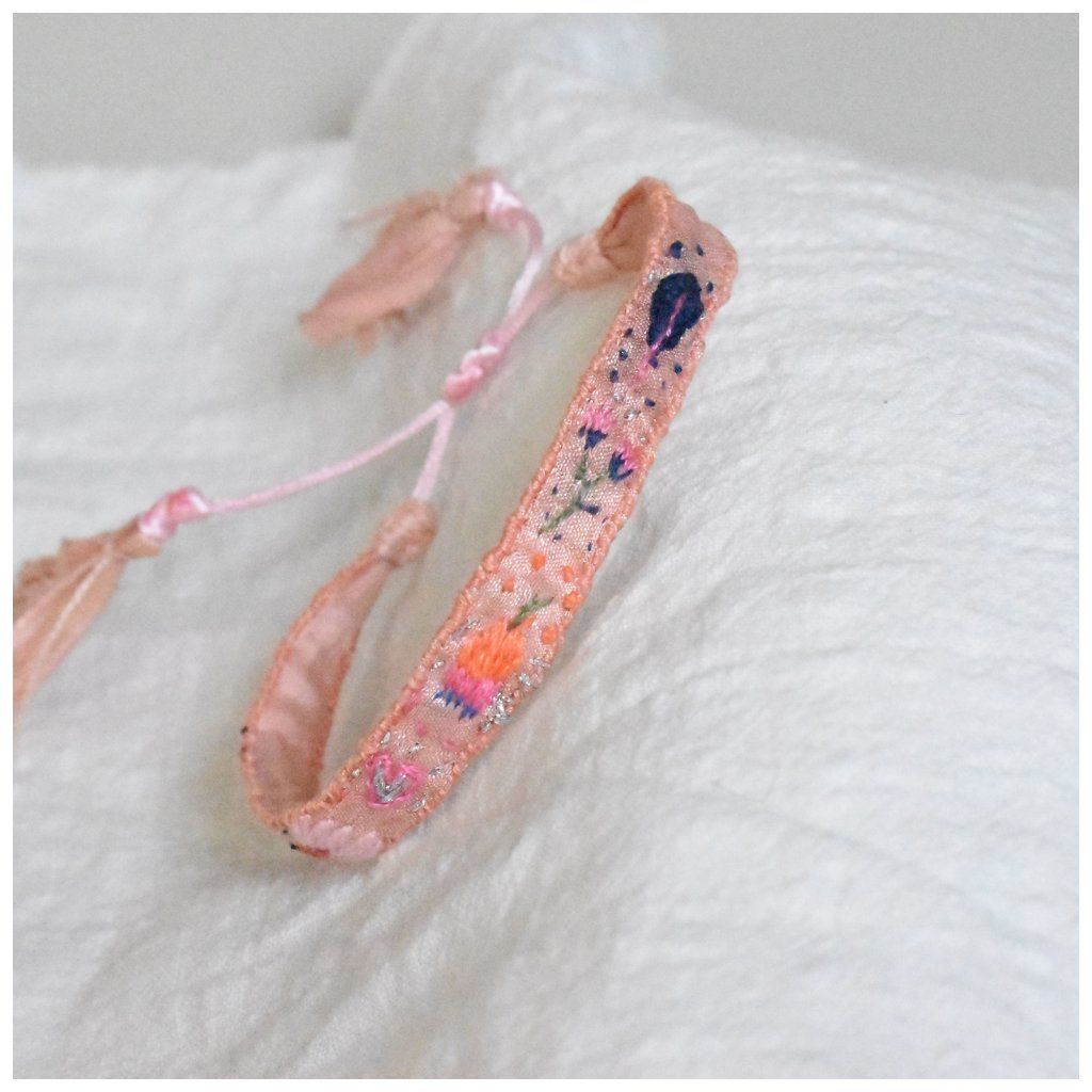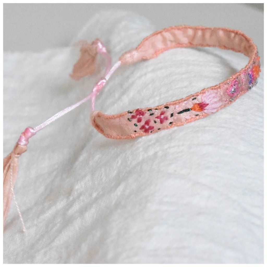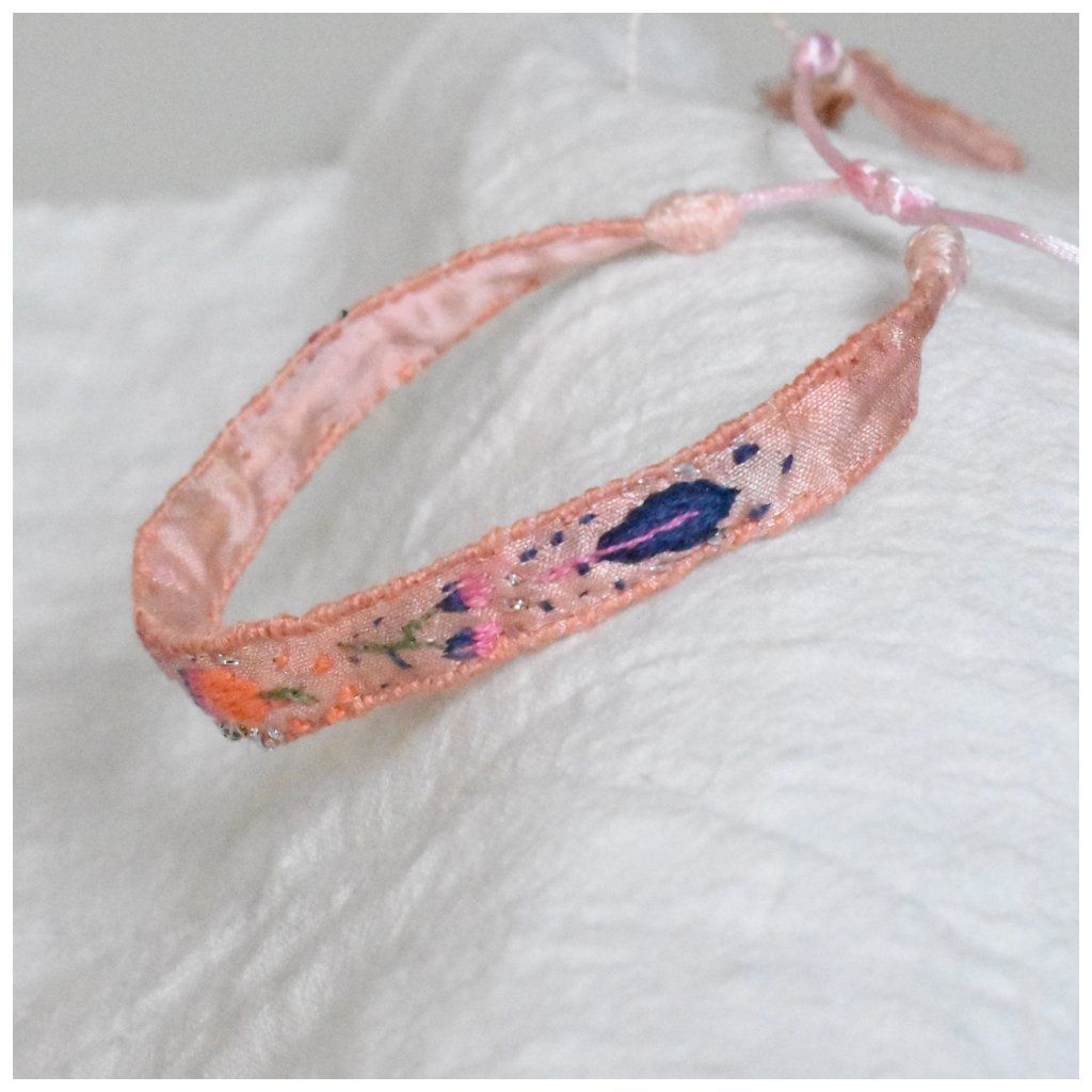 Tento náramek z kolekce Silk Stories – Artefakty času je zhmotněním křehkosti a trpělivosti. Na podkladu z recyklovaného sárí hedvábí, které je ručně barveno do jemných, zastřených odstínů meruňkové, rozkvétá drobná zahrada barevných motivů.
