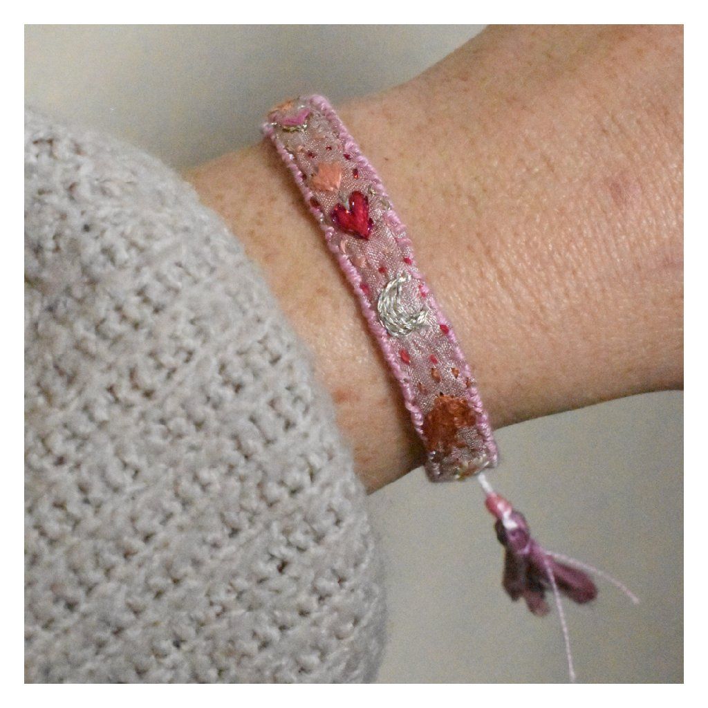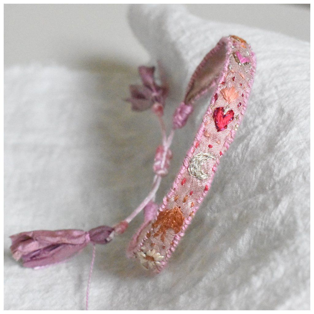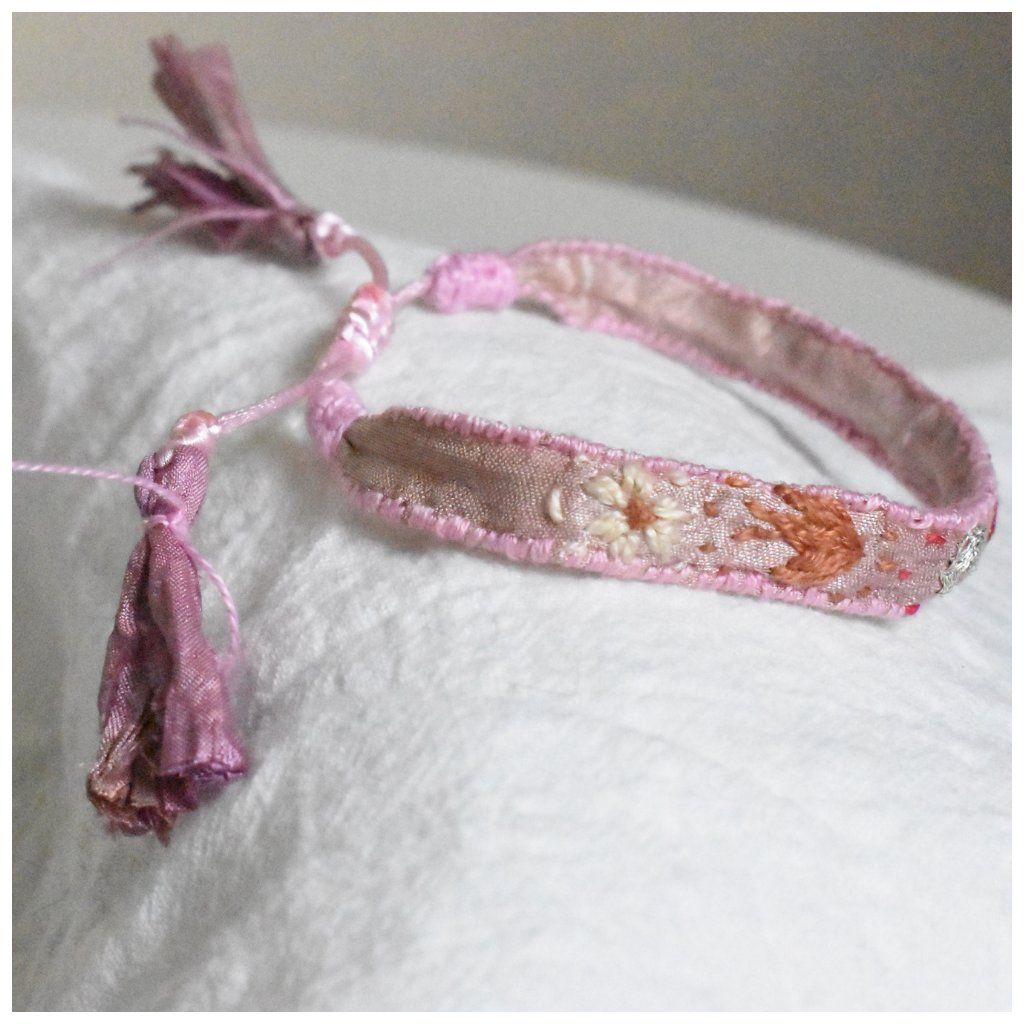 Tento náramek z kolekce Silk Stories – Artefakty času je zhmotněním křehkosti a trpělivosti. Na podkladu z recyklovaného sárí hedvábí, které je ručně barveno do jemných, zastřených odstínů pudrově růžové, rozkvétá drobná zahrada barevných motivů.