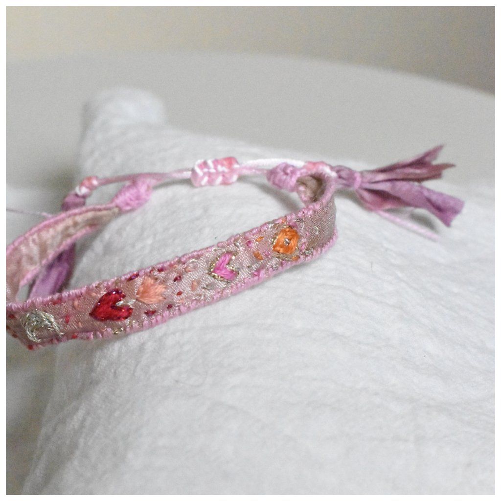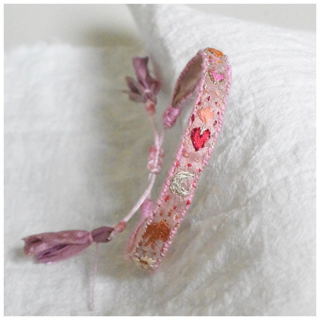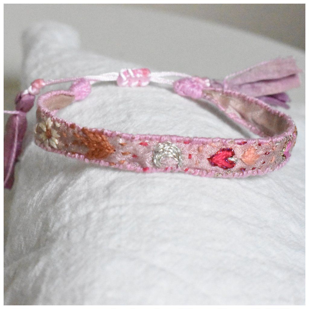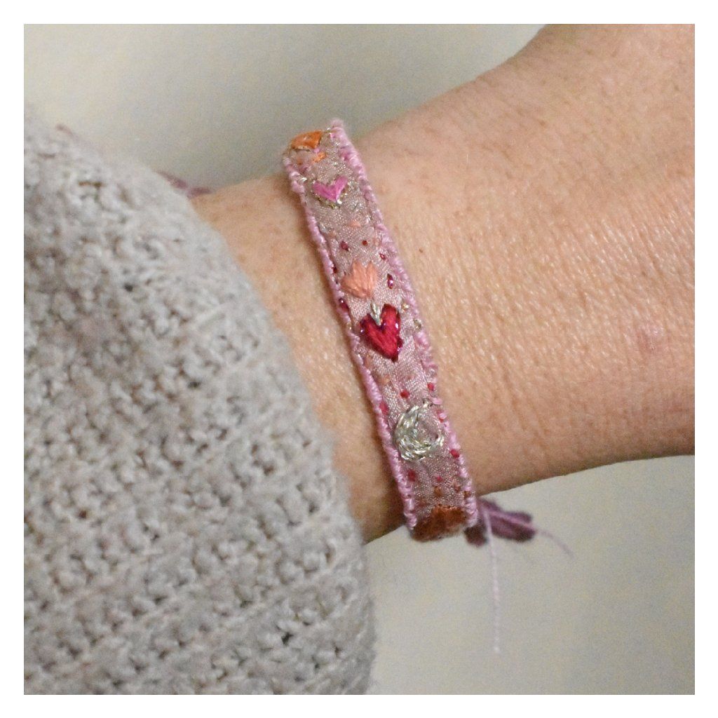 Tento náramek z kolekce Silk Stories – Artefakty času je zhmotněním křehkosti a trpělivosti. Na podkladu z recyklovaného sárí hedvábí, které je ručně barveno do jemných, zastřených odstínů pudrově růžové, rozkvétá drobná zahrada barevných motivů.
