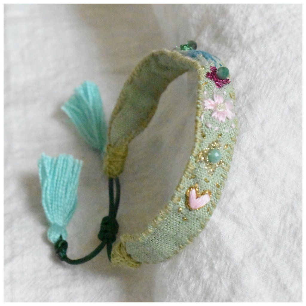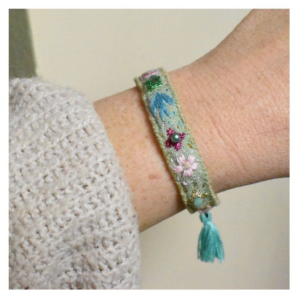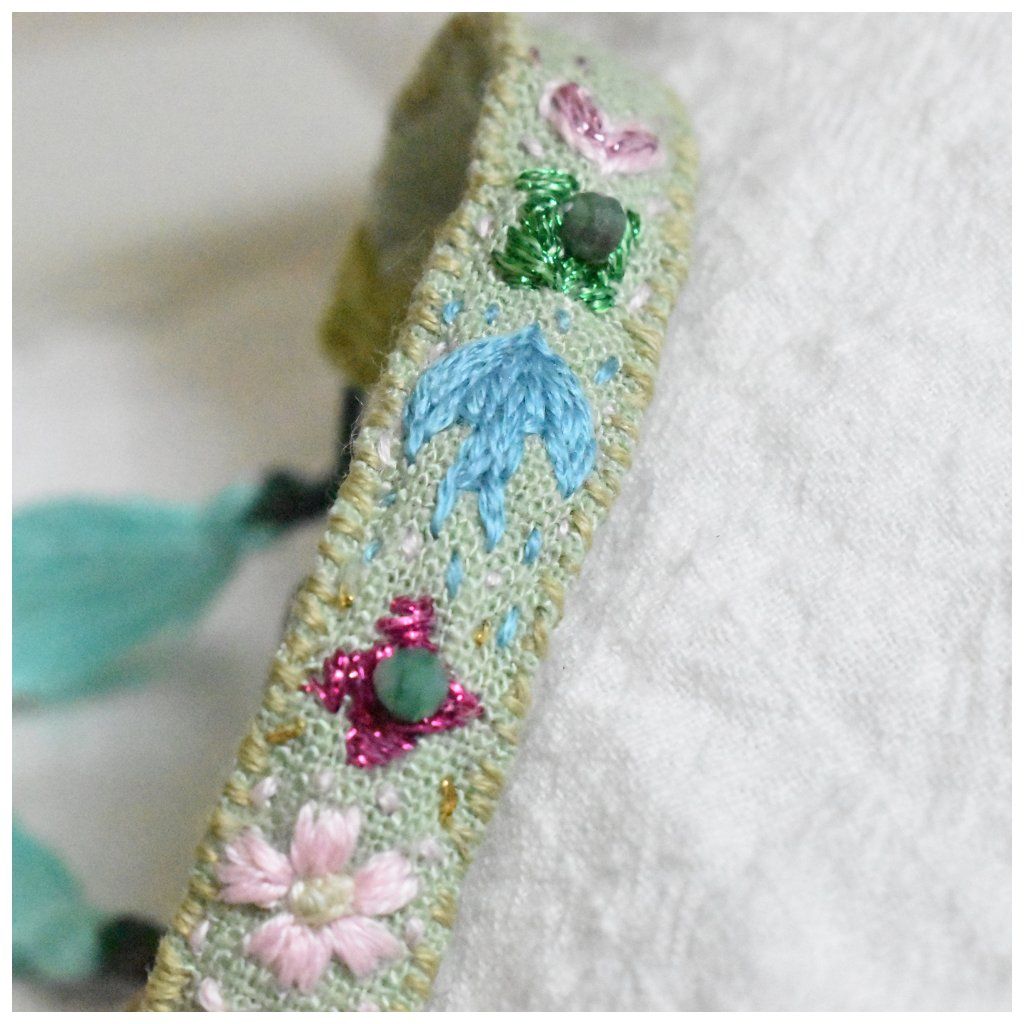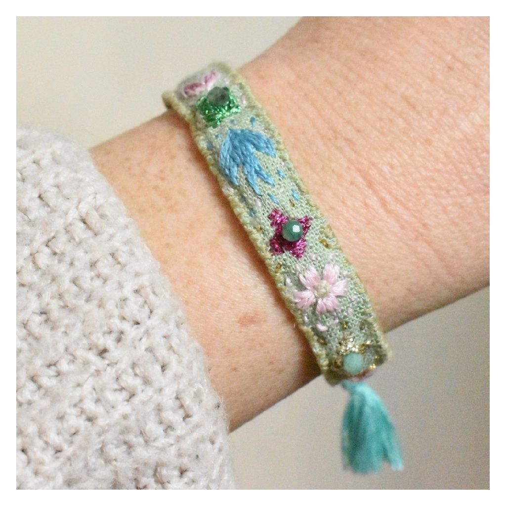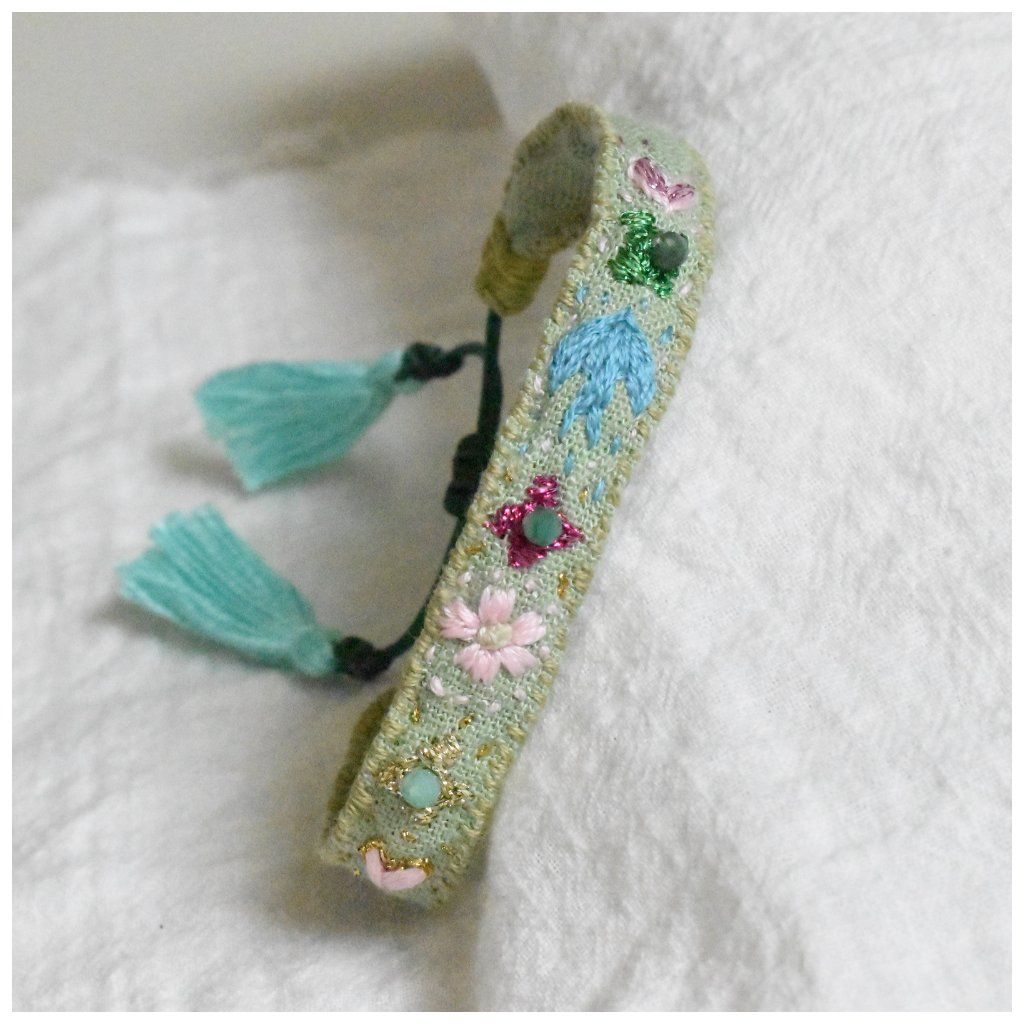 Vyšívaný lněný náramek Flores se smaragdy