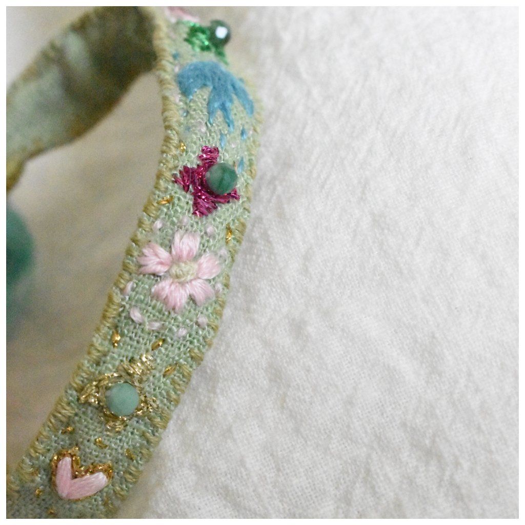 Tento model z kolekce Flores v sobě nese nádech luxusu a přírody. Ruční výšivka je citlivě doplněna broušenými korálky pravého smaragdu, které náramku dodávají jemný třpyt a jedinečnou energii. Drobné drahokamy vnášejí do lněného základu eleganci a dělají z náramku skutečný sběratelský kousek.