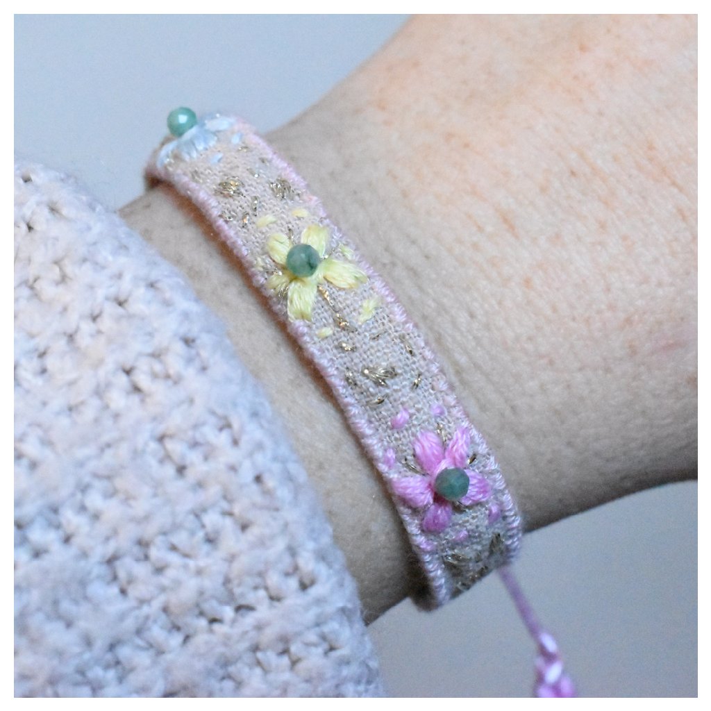 Tento model z kolekce Flores v sobě nese nádech luxusu a přírody. Ruční výšivka je citlivě doplněna broušenými korálky pravého smaragdu, které náramku dodávají jemný třpyt a jedinečnou energii. Drobné drahokamy vnášejí do lněného základu eleganci a dělají z náramku skutečný sběratelský kousek.