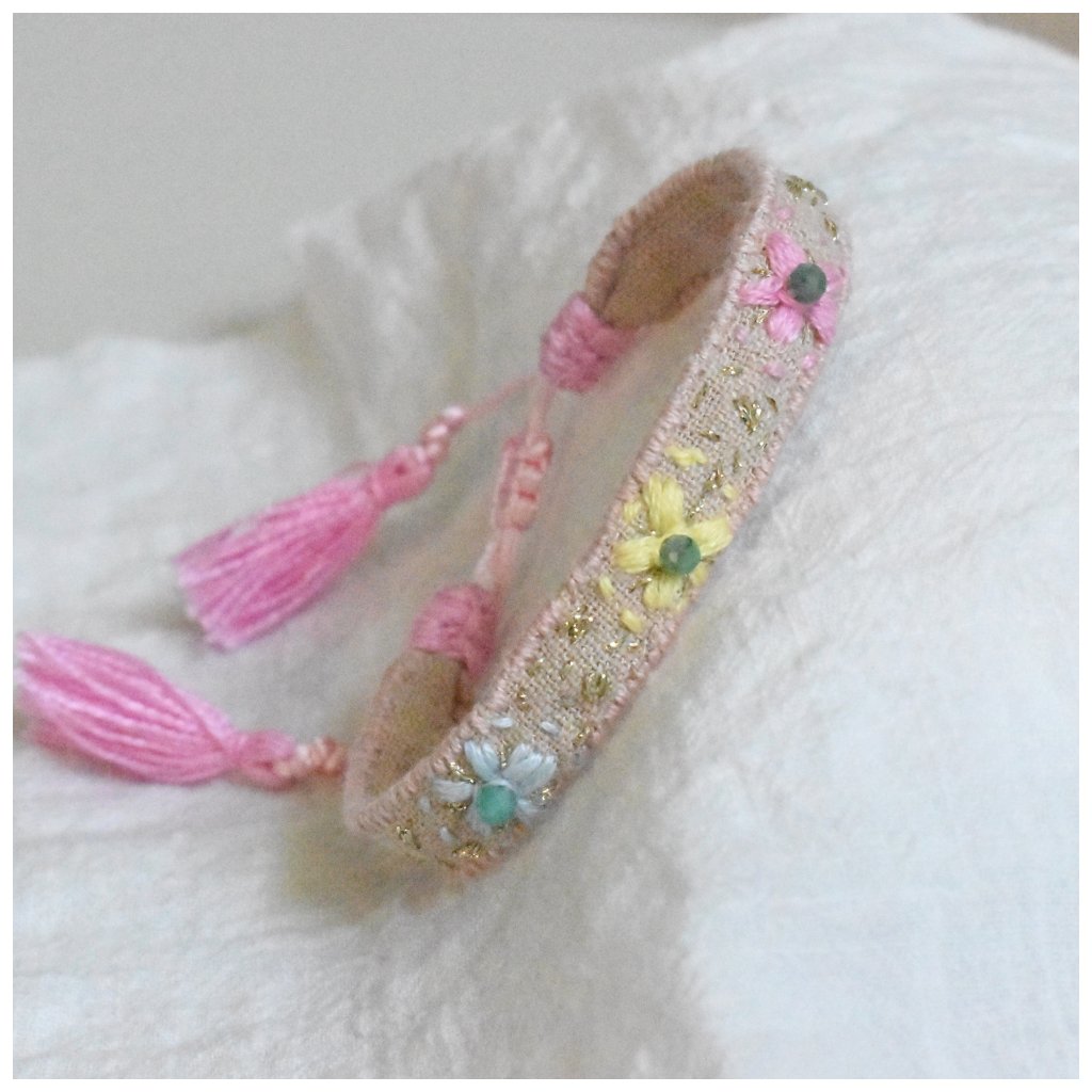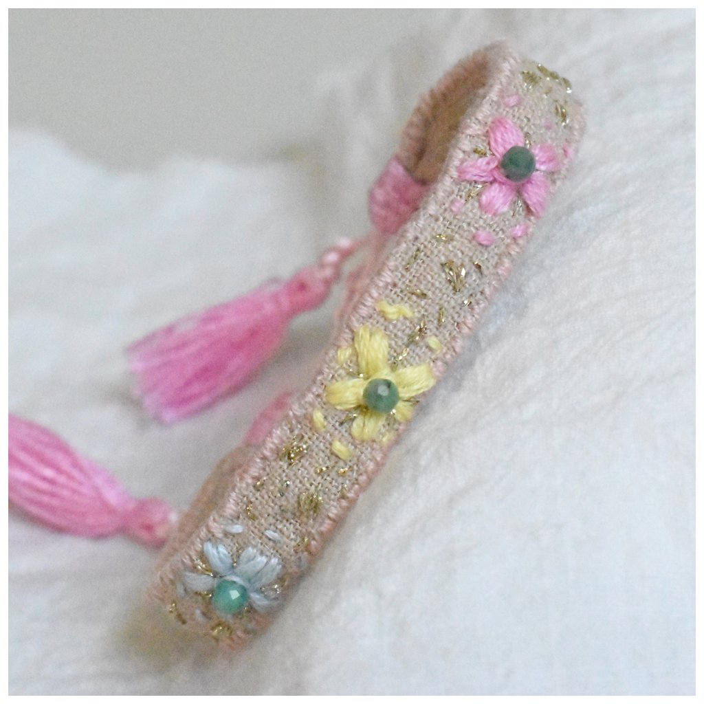 Vyšívaný lněný náramek Flores se smaragdy