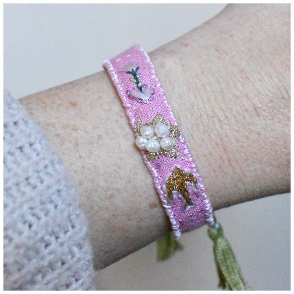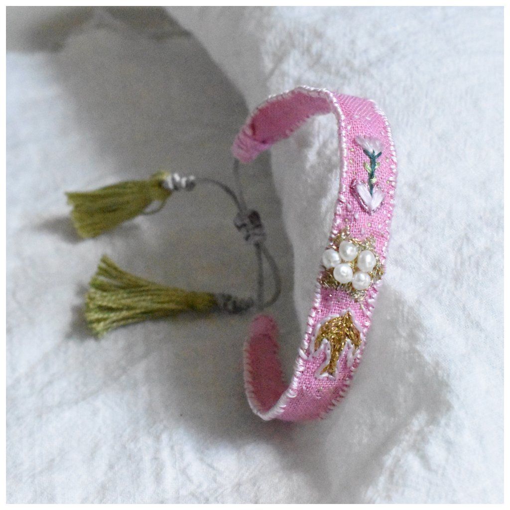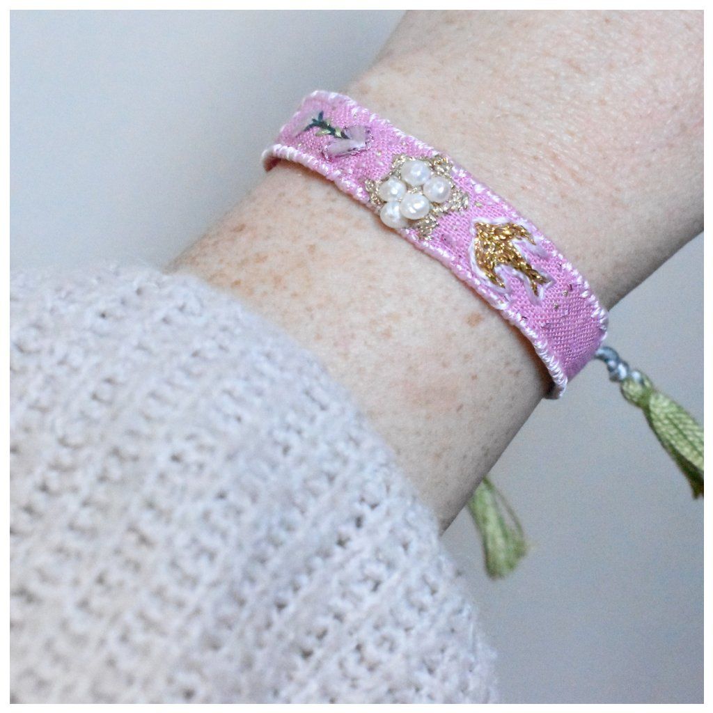 Tento ručně vyšívaný náramek na růžovém lnu je víc než jen šperk – je to osobní talisman, který v sobě nese dva silné příběhy. Jemný podklad doplňují pravé říční perly, které jsou odedávna symbolem čistoty, ženskosti a vnitřní síly.