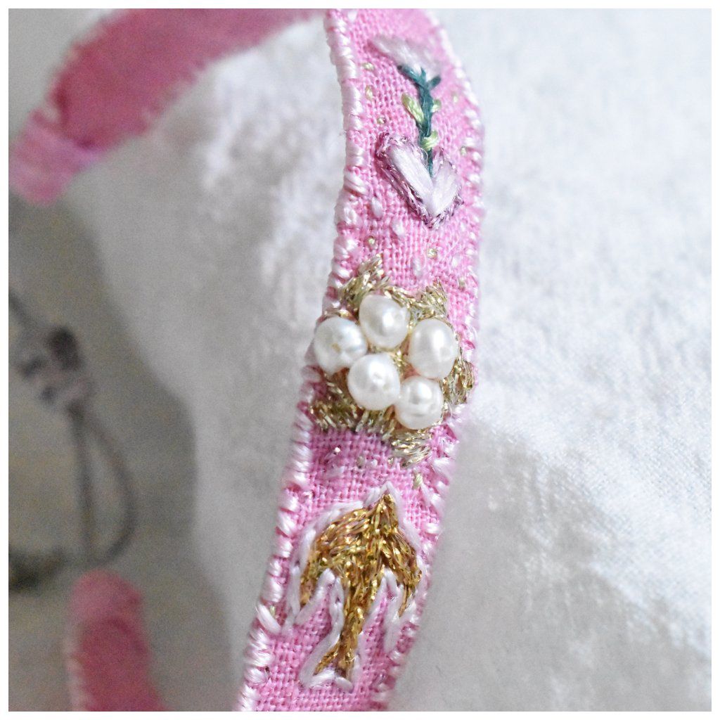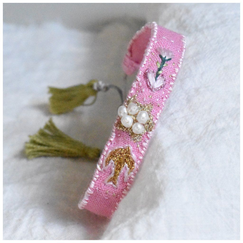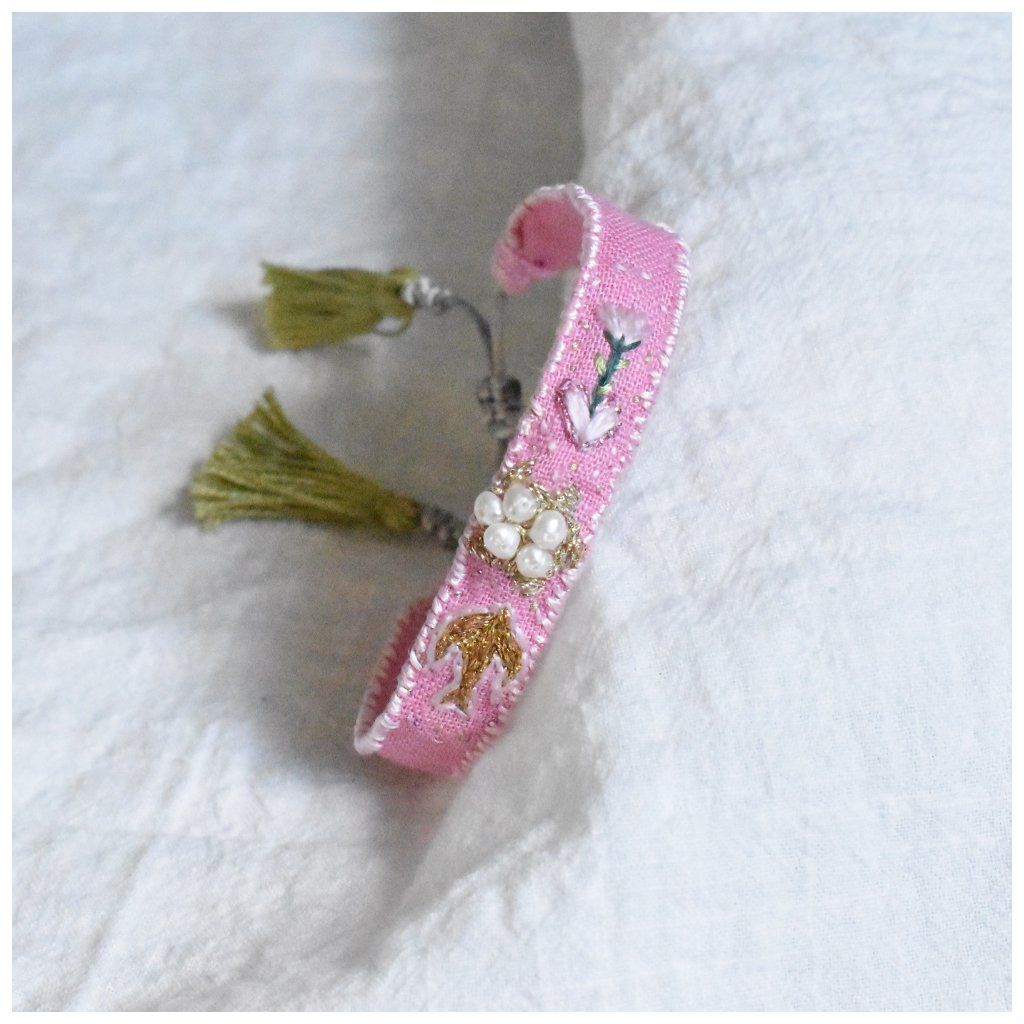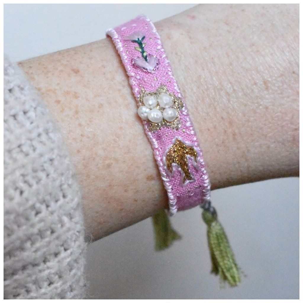 Tento ručně vyšívaný náramek na růžovém lnu je víc než jen šperk – je to osobní talisman, který v sobě nese dva silné příběhy. Jemný podklad doplňují pravé říční perly, které jsou odedávna symbolem čistoty, ženskosti a vnitřní síly.